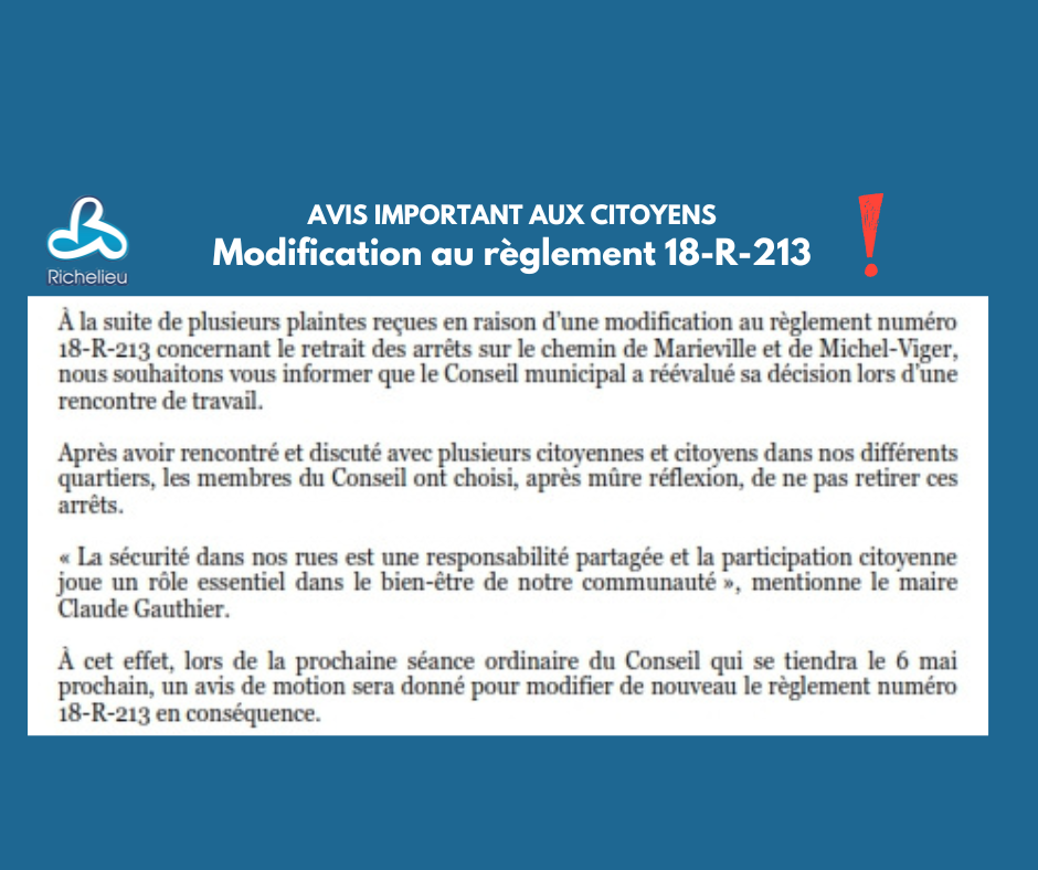 Avis important aux citoyens Modification au règlement 18-R-213
