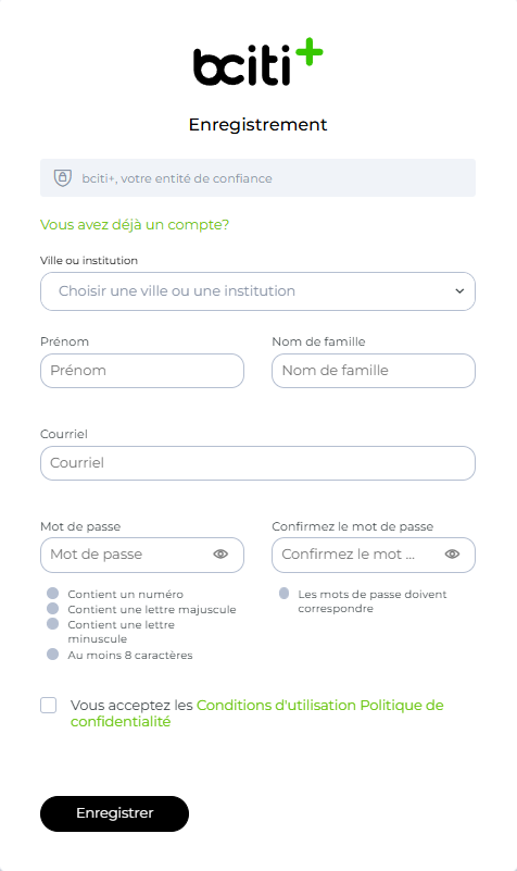 Vous avez deux options : téléchargez l’application mobile bciti+ depuis l’App Store (iOS) ou Google Play (Android). Connectez-vous ensuite au portail web via le site de votre ville ou directement sur [bciti+] (https://www.bciti.com).